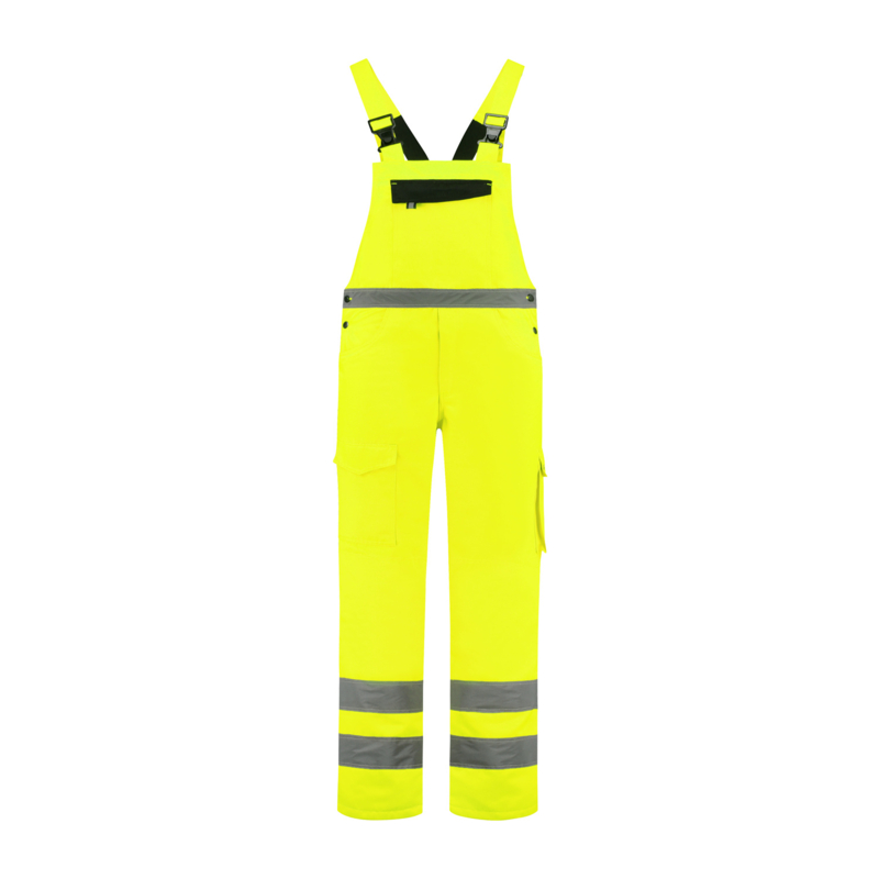 Am. Overall high visibility RWS, 80% polyester / 20% katoen, 280 grams, YKK ritssluiting, grote afsluitbare borstzak, 2 insteekzakken, 2 intasten, elastiek in de taill, 2 afsluitbare achterzakken, dijbeenzak groot links, dijbeenzak klein rechts, kniezakken binnenzijde, duimstokzak.